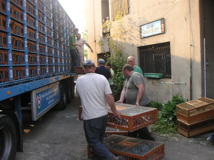 Załadunek koszy z gołębiami pocztowymi na kabine transportową która zawiezie gołębie pocztowe na lot.